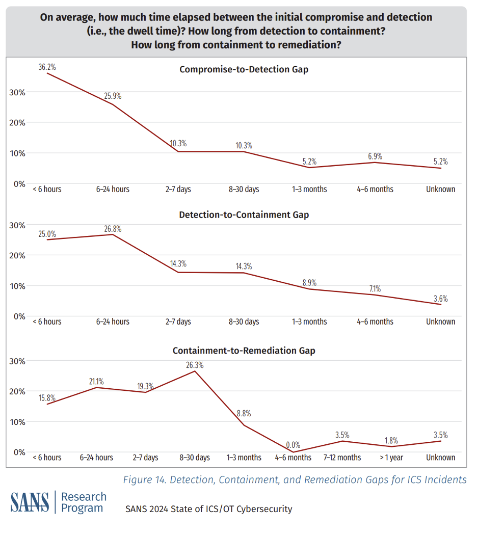 - “Industry continues to improve in detection times for ICS/OT incidents, with nearly 50%of incidents being detected within the first 24 hours. Second, we are similarly improving on containment, with over 65% of detection-to-containment gaps being addressed in theproceeding 24 hours. That means, on average, ICS/OT incidents are detected and containedwithin 48 hours.” [3]