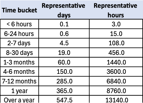 [4] Methodology used to determine mean value: First, the time buckets needed to be converted into their representative days/hours values (i.e., a value in the middle of the time bucket), as they are all different sizes. This representation is then used against the survey data to estimate the mean. The following representations were used: